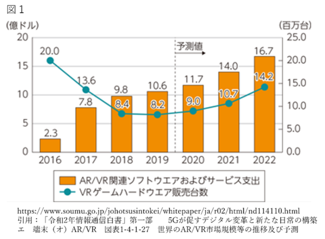 総務省の「令和2年情報通信白書」によると2022年のAR/VR関連ソフトウエアおよびサービス支出16.7億ドルと予想されています。*1