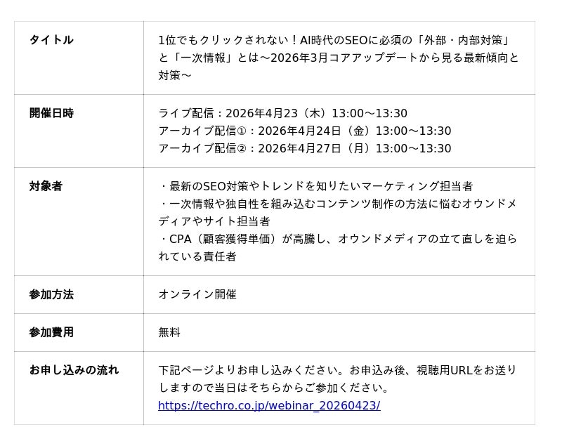 本ウェビナーは、2026年3月に発生したGoogleコアアップデートの傾向・対策と合わせて解説。