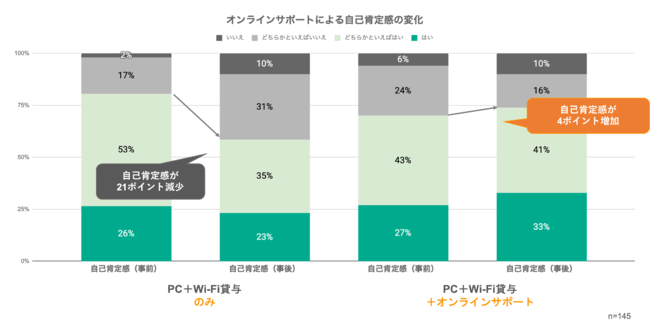 「オンラインサポートを受けた家庭」と、「オンラインサポートを受けなかった(PC・Wi-Fiのみを提供した)家庭」の2つに対し、「私は自分に満足している」などの自己肯定感に関する10項目について「はい」「どちらかといえばはい」「どちらかといえばいいえ」「いいえ」の4段階で回答をしてもらった結果、メンターによりオンラインサポートを利用していない(PC・Wi-Fiのみを提供した)グループでは21ポイント減少、一方で、オンラインサポートを利用したグループは、4ポイント増するという結果が得られました。この結果から、オンライン環境だけでなく、人が介在してメンタリングを行うというオンライン支援をセットで行うことの有用性が推測されます。