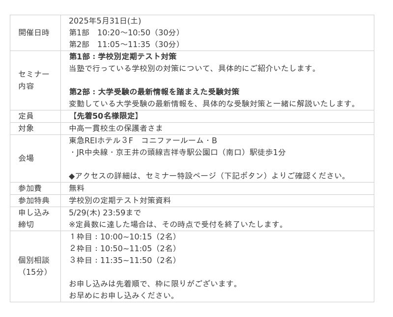 株式会社メイツ(本社:東京都新宿区 代表取締役:遠藤尚範)が運営する『中高一貫校専門 個別指導塾WAYS(以下、WAYS)』では2025年5月31日(土)に吉祥寺にて、中高一貫校に通う生徒・保護者さまを対象とした、学校別の対策法紹介セミナーを開催いたします。