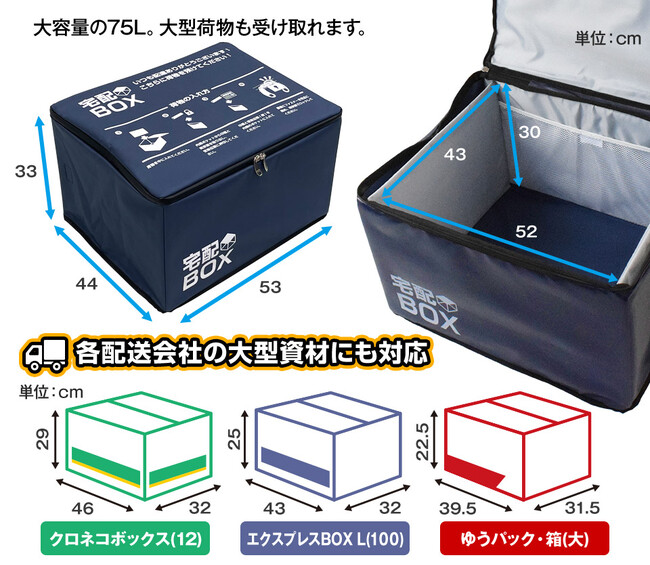 サイズは大容量の75Lタイプなので、大型の荷物も安心して受け取ることができます。