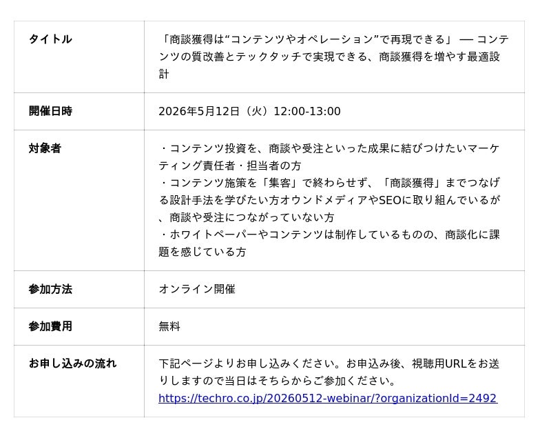 【商談獲得へ繋げたい方必見!】テクロ、オウンドメディア運用などのコンテンツへの投資を成約への動線にする手法を5/12(火)12時〜解説