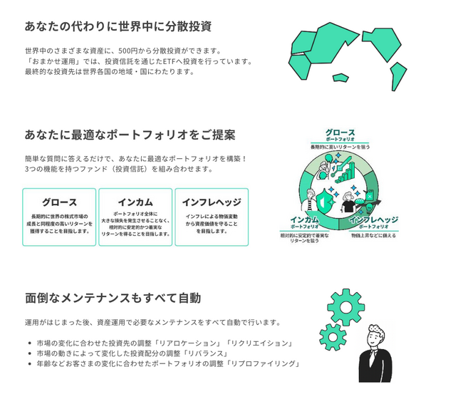 「おまかせ運用」は、一人ひとりの年齢や金融資産、就業状況の有無等に応じた最適なポートフォリオを、3つの機能を持つファンド(投資信託)を用いて構築し、自動で運用を行うサービスです。
