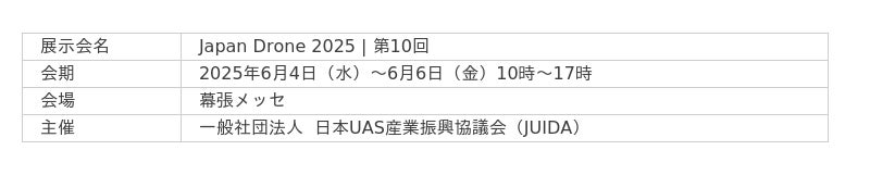 自社開発の国産産業用ドローンとクラウドサービスを通じてさまざまなソリューションを提供するエアロセンス株式会社(所在地?東京都北区、代表取締役社長?佐部浩太郎、以下「エアロセンス」)は、2025年6月4日(水)から6日(金)まで幕張メッセで開催される「Japan Drone 2025 第10回」に出展することをお知らせいたします。(エアロセンスブース場所:幕張メッセ 展示ホール6エリア BE-3)