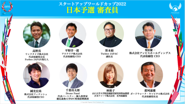 スタートアップワールドカップは、世界のスタートアップエコシステムの構築と起業家精神の育成を目的とする、ペガサス・テック・ベンチャーズ主催のスタートアップピッチコンテストです。世界70地域・国以上で予選が行われ、サンフランシスコで開催される決勝大会には世界トップクラスのスタートアップ、VC、起業家、大手企業が集結し、優勝企業には約1億円の投資賞金が贈られます。日本代表を選出する日本予選を、7月21日(木)にグランドハイアット東京にて開催。書類選考を突破したスタートアップ10社が約3,000人の観客を前に、自社のビジネスプランのプレゼンを日本語でおこない、日本代表1社が選出されます。日本代表はその後、2022年9月28日から30日にかけてサンフランシスコで行われる世界決勝戦へと勝ち進みます。