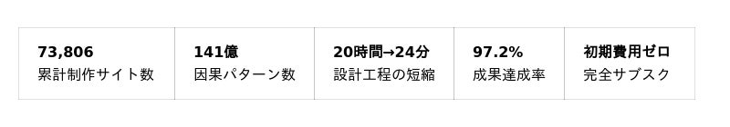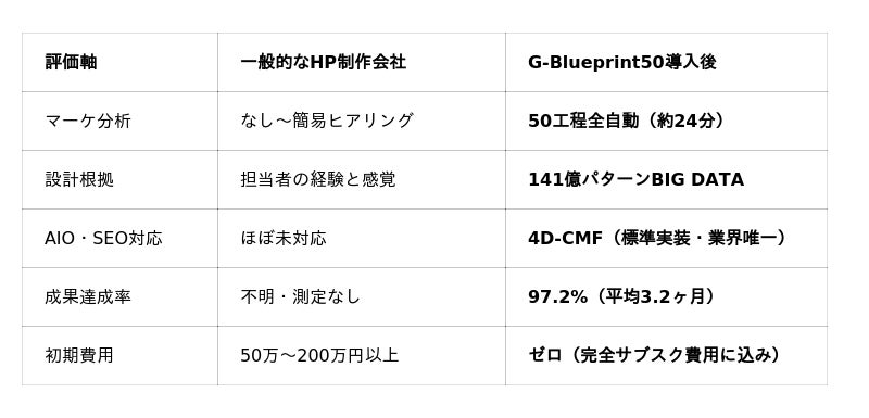 G-Blueprint50は、その構造を技術で内側から壊します。15年間・73,806サイトのデータが証明する「成果が出る設計の法則」を、どの制作会社でも再現できる形に自動化しました。これは単なる効率化ではなく、『分析密度そのものを工業化した』システムです。