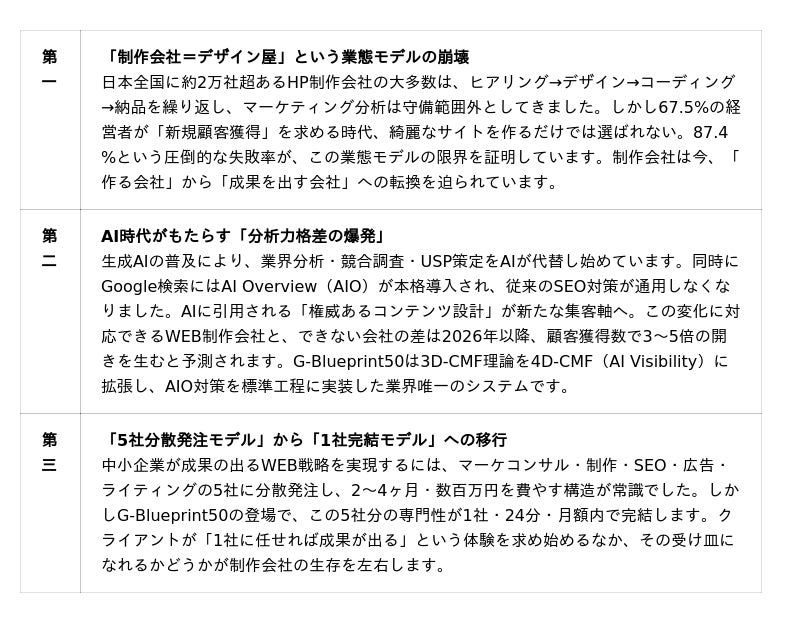なぜいま、G-Blueprint50が必要なのか。背景には、WEB制作業界を根底から揺さぶる3つの構造転換があります。[表2: https://prtimes.jp/data/corp/60260/table/36_2_09f866a608187a5c2dc05e3e02691ad1.jpg?v=202604070845 ]