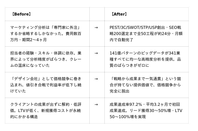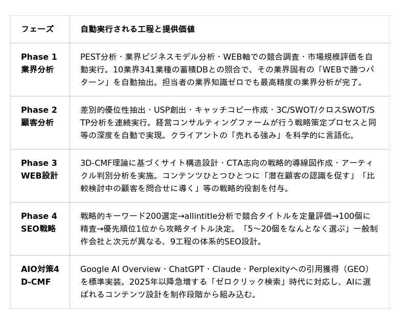 従来、WEB制作会社が実施できていなかった「業界分析→競合調査→USP創出→サイト設計→SEO戦略」を一気通貫で自動実行。外部のマーケティングコンサルタントに依頼すれば2〜4ヶ月・数百万円が必要な内容を、月額サブスクリプション内・約24分で完了させます。