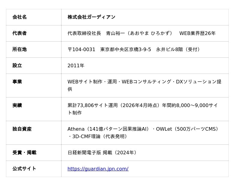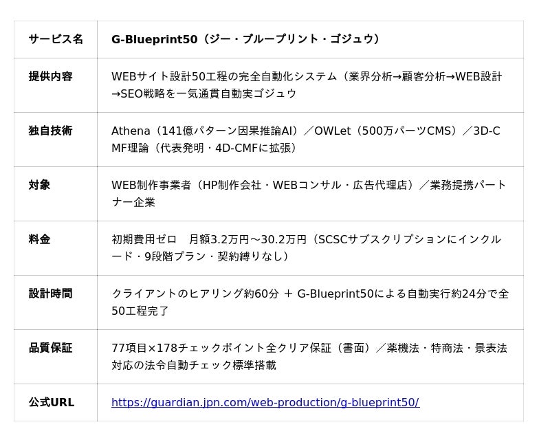 株式会社ガーディアン(東京都中央区、代表:青山裕一)は、この構造矛盾を根本から解体するシステム「G-Blueprint50」を正式リリースしました。PEST分析から戦略的キーワード200選定・allintitle分析まで、WEBサイト設計の50工程を完全自動実行。かつて20時間を要した工程が、約24分で完了します。国内WEB制作市場が1兆円規模に達し、業界の二極化が加速する今、『成果を設計できる会社』だけが生き残れる時代が始まりました。