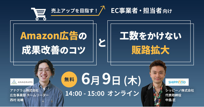 ECから倉庫への出荷指示に関連する一連の業務を自動化するアプリ「シッピーノ」を提供するシッピーノ株式会社(本社:神奈川県茅ヶ崎市、代表取締役:中島匠)は、運用型広告のリーディングカンパニーのアナグラム株式会社(本社:東京都渋谷区、代表取締役:阿部圭司)、アマゾンジャパン合同会社と共催で、2022年6月9日(木)14:00より無料のセミナー「売上アップを目指す!Amazon広告の成果改善のコツと、工数をかけない販路拡大」をオンライン開催いたします。