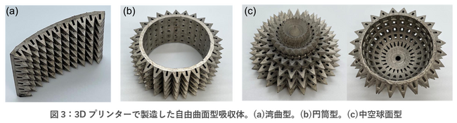 また、本研究の3Dプリンターを使った作製方法は、吸収体の大面積化が容易であることに加え、湾曲・円筒・球面などのさまざまな形状を作製できるという特徴を持ちます(図3)。このような吸収体を作製することで、特定の方位から伝搬するテラヘルツ波を高効率に検出できるようになります。この特徴を利用すると、テラヘルツ波の絶対強度だけでなく、離れた位置のアンテナから放射されるテラヘルツ波の分布や広がり幅の測定などが可能になると期待され、テラヘルツ波検出技術のさらなる高度化につながります。