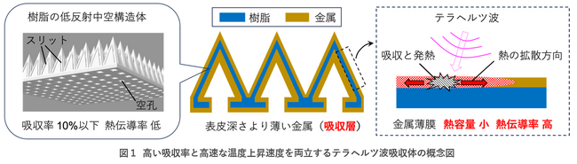 そこで我々は金属の表皮深さより薄い1 nmから100 nmの金属薄膜を構造体表面に形成することを考えました。表皮深さより薄い金属薄膜は吸収層として利用できるため、樹脂の非常に小さな吸収率を補うことができます。また、金属薄膜の熱容量は小さく、金属薄膜がテラヘルツ波を吸収することにより発生した熱エネルギーで、金属薄膜に大きな温度上昇が生じます。さらに、熱エネルギーは温度勾配と熱伝導率が大きな場所へと流れ込みます。金属薄膜の熱伝導率は樹脂よりも1桁以上大きいため、図1に示すように、金属薄膜で発生した熱エネルギーは樹脂ではなく金属薄膜の方向に伝わります。この効果により、金属薄膜層全体が樹脂よりも高速に温度上昇し、単なる樹脂中空構造体よりも温度上昇速度を向上させることができます。