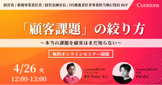 顧客企業のビジネス変革を成功に導くキュレーションズ株式会社(本社:東京都渋谷区、代表取締役社長:根本隆之、以下当社)は、『「顧客課題」の絞り方 〜本当の課題を顧客はまだ知らない』を2022年4月26日(火)に開催いたします。