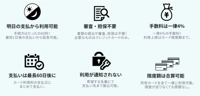 個人事業主・法人企業を対象とした「支払い.com」は、企業間の取引におけるあらゆる銀行振込のお支払いを、ユーザーがお持ちのクレジットカードで決済できるサービスです。お支払いをクレジットカードのお引落日まで延長することで、ユーザーは資金繰りの改善が可能となります。また、ユーザーは書類の提出や面談、審査は必要ありません。仕入れや外注費の支払いはもちろん、人件費や家賃の保証金等にも幅広く利用できます。