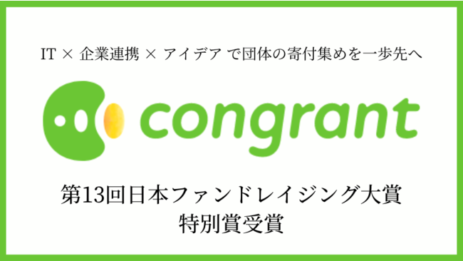NPO・非営利団体向け寄付システム「congrant(コングラント)」を提供するコングラント株式会社(本社:大阪市西区、代表取締役:佐藤正隆)は、先駆的なファンドレイジングの取り組みを行ったNPOや企業を称える「日本ファンドレイジング大賞」の第13回 特別賞を受賞しました。