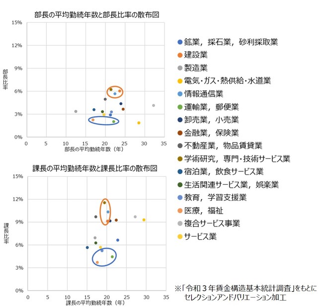・管理職比率が高い産業では、管理職比率が低い産業よりも、管理職の平均勤続年数が長い傾向にあることが明らかになりました。