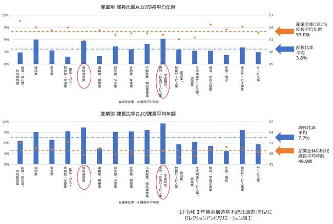 ・ 産業全体における部長の平均年齢は53.0歳、課長の平均年齢は48.9歳でした。