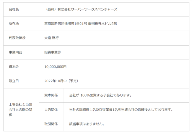 今後の連続する市場の変化へ対応し持続的な成長を実現するため、当社グループの企業価値向上に寄与する技術・サービスを保有する事業企業への投資・M&Aを通して、当社グループのケイパビリティの補強、サービス体制の強化、サービス供給力の増強、顧客基盤の獲得などスピード感を持って実現するためにサーバーワークスベンチャーズを設立することにいたしました。