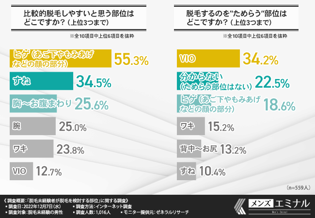 そこで今回、メンズ医療脱毛クリニック『メンズエミナル』(https://mens-eminal.jp/lp/?refmedia=31073)は、脱毛未経験の男性を対象に、「脱毛未経験者が脱毛を検討する部位」に関する調査を実施しました。
