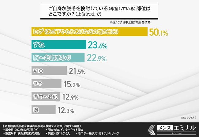 「ご自身が脱毛を検討している(希望している)部位はどこですか?(上位3つまで)」と質問したところ、『ヒゲ(あご下やもみあげなどの顔の部分)(50.1%)』と回答した方が最も多く、次いで『すね(23.6%)』『胸〜お腹まわり(22.9%)』と続きました。