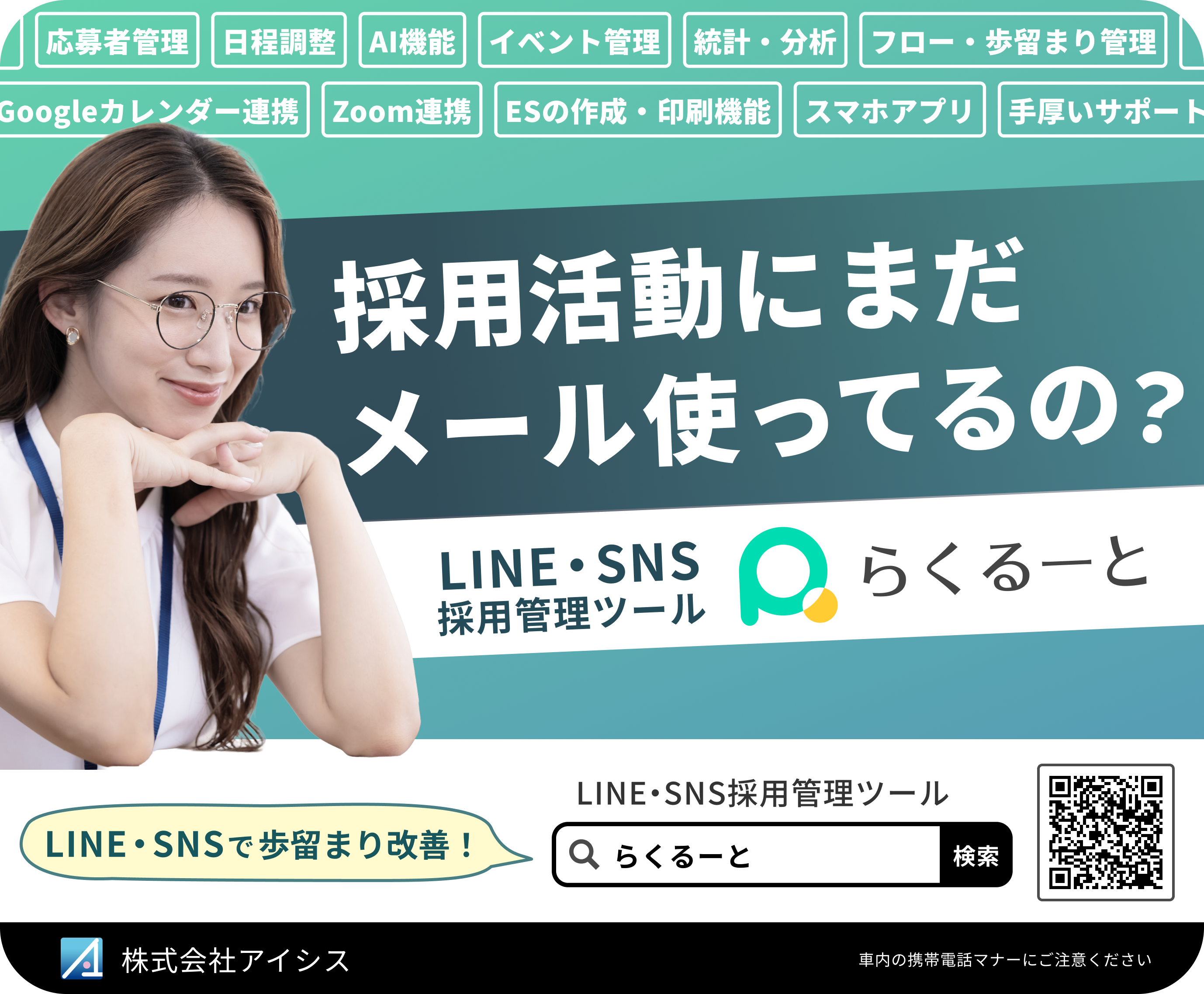 [画像2: https://prcdn.freetls.fastly.net/release_image/86226/41/86226-41-fa7911ffbb64638250ab432cc0ce8dd8-2756x2274.png?width=536&quality=85%2C75&format=jpeg&auto=webp&fit=bounds&bg-color=fff ]「採用活動にまだメール使ってるの? LINE・SNS採用管理ツール らくるーと」