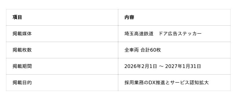 本広告は、2026年2月1日から2027年1月31日までの1年間、埼玉高速鉄道の全車両に合計60枚掲出され、通勤・通学などで鉄道を利用される多くの方々に向けて、「らくるーと」の認知向上と採用DXの浸透を図ります。