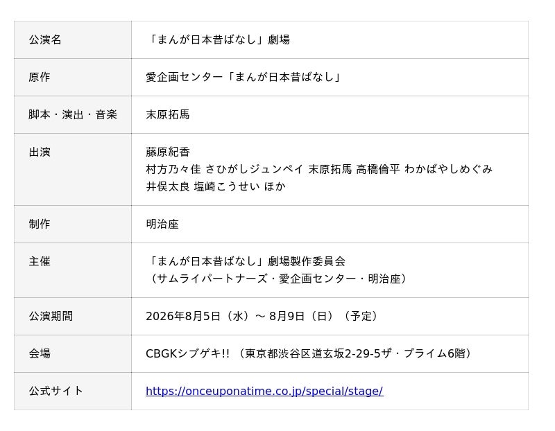 「まんが日本昔ばなし」劇場製作委員会(サムライパートナーズ・愛企画センター・明治座)は、2026年夏、東京・渋谷「CBGKシブゲキ!!」にて『「まんが日本昔ばなし」劇場』を上演する運びとなりました。