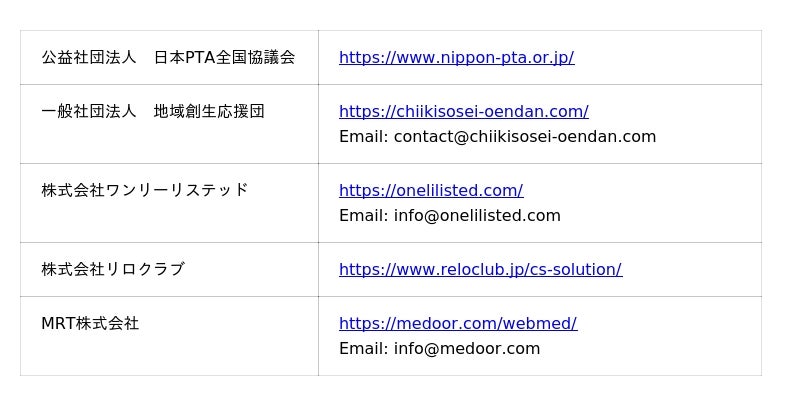 [表: https://prtimes.jp/data/corp/124568/table/42_1_4675db626425892cdcfbac2e6e4a89d5.jpg?v=202512260445 ]<PTA支援事業に関する問い合わせ先>