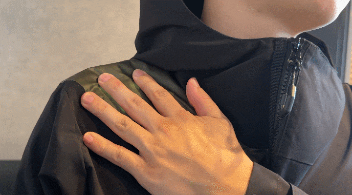 1.外気温で色が変わるサーモクロミック・ファブリックを採用。ライトグリーンからダークグレー、ブラックへと変化。1着で無限通りのファッションが楽しめる