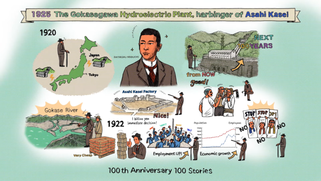 当社周年事業 の一つとして、従業員から募集した旭化成グループの歴史を彩るエピソード100話を、「100 Stories」として社内公開しています。本イベントではその中から6本を厳選し、映像化することで、創業者である野口遵の開拓者精神や、多様な人財や技術から成る総合力、“いのち”と“くらし”への貢献といった、旭化成のDNAを再認識しました。
