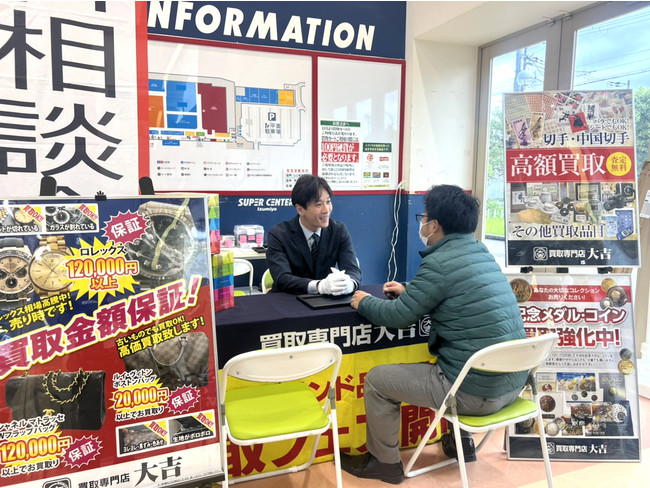 「大買取フェア」では、特に買取へまだ行ったことがない方に、「どんな査定士が居るのか」「どんなものが売却できるのか」「どんな雰囲気で買取されるのか」といった「リユース体験」をしていただきたいと考え、2021年3月から開始した取り組みで、これまでの実施回数は100回を超えます。多くの方が日常的に利用する身近な場所であるスーパーマーケットや公民館などへ「買取大吉」の査定士が出張し、お持ちいただいた中古品の査定を行います。会場には車でお越しの方も多くいらっしゃるため、査定士にお声がけいただければ駐車場までご一緒し、大切なお品を査定会場にお運びするなど、「大買取フェア」ならではのサービスも行っております。お買い物のついでに査定だけでも、といったご利用でも大歓迎です。
