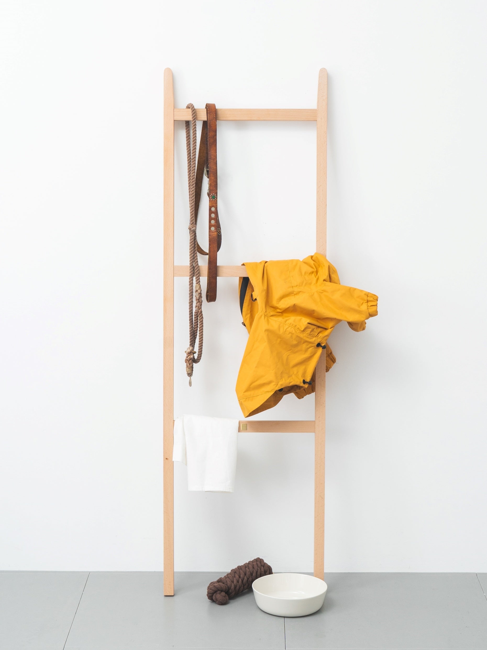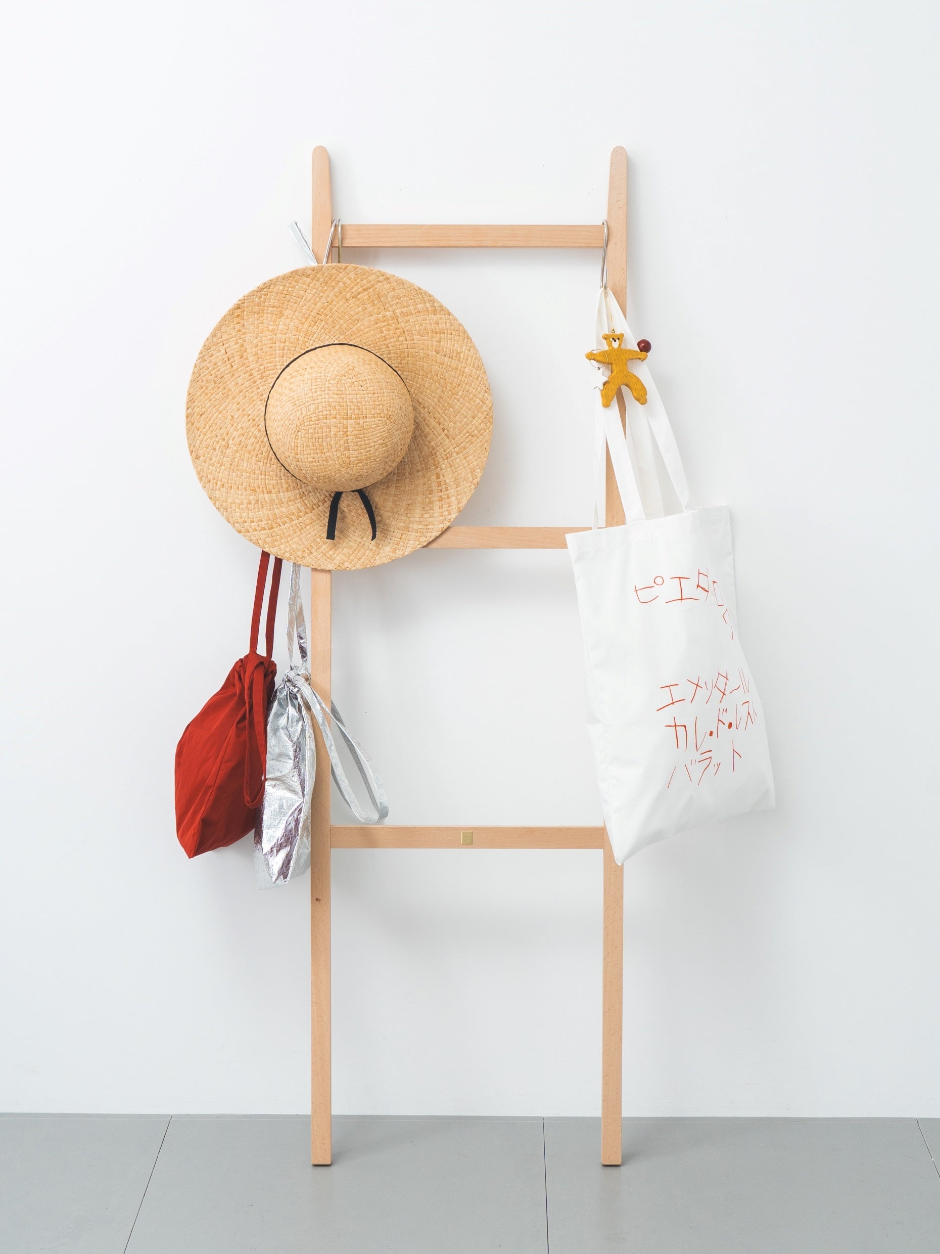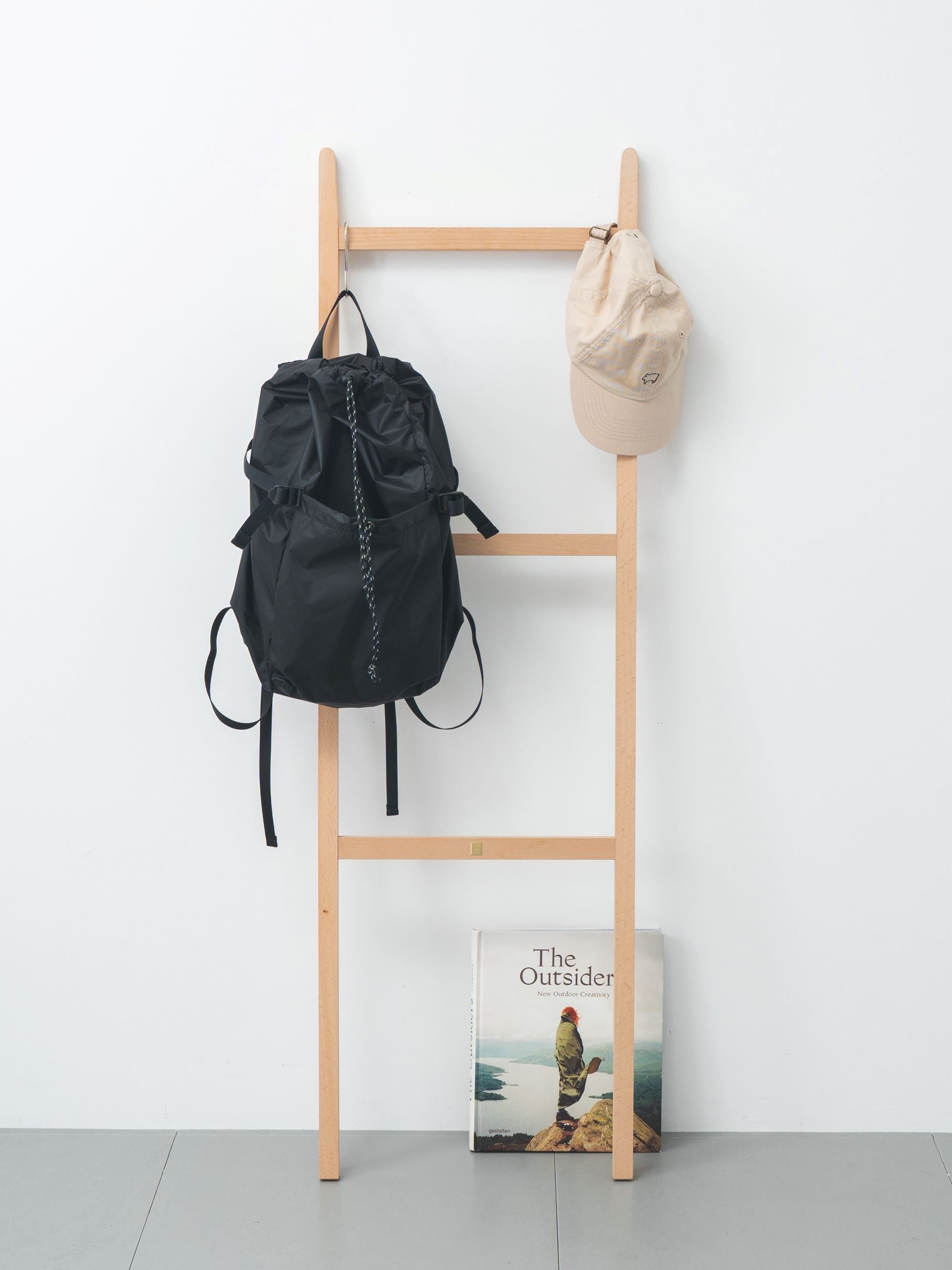 日々の愛用品の "止まり木" として、帽子やショルダーバッグ、 ストールなどを掛けておくラダーラック。壁に立てかけて使用してください。玄関先やリビング、浴室周りに置けばタオル掛けとしても使えます。圧迫感がなく、ごくシンプルで癖のないデザインなので、どんなテイストの住空間にもすっと馴染みます。