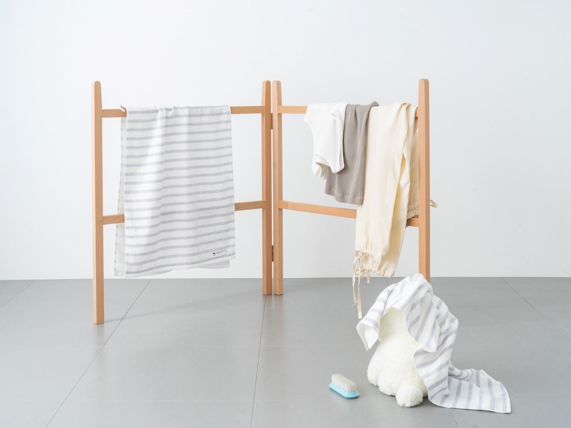 浴室周りにおいてバスタオルや着替え等を掛けておくのが基本的な使い方ですが、キッチンに置いてクロスやエプロンを掛けたり、S字フックを使えばバッグや帽子などを掛けることも出来ます。 素材/カナダ産 ブナ 無垢材 サイズ/幅:760mm(半開時785mm)高さ:850mm 奥行:50mm(半開時785mm)