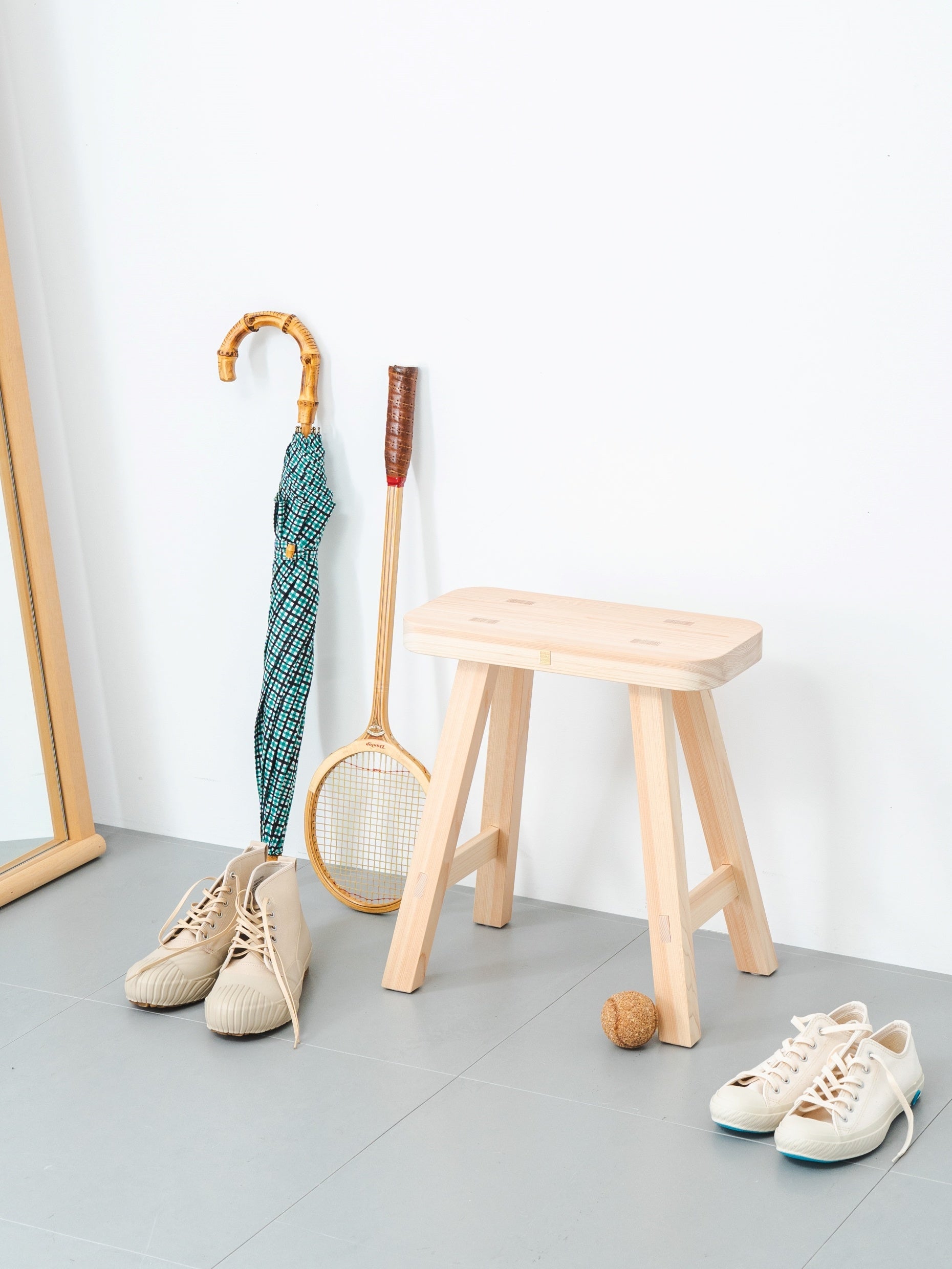 幅40cm、高さ44cm というコンパクトでシンプルなスツールは、何気なく置くだけで玄関の風景をセンス良く整えてくれます。靴を脱ぎ履きする時の腰掛として、或いは帰宅時のちょっとした荷物置きとしても。 素材/京都産 ヒノキ 無垢材 サイズ/幅:400mm 高さ:440mm 奥行:262mm 座面のサイズ/幅:400mm 奥行:190mm