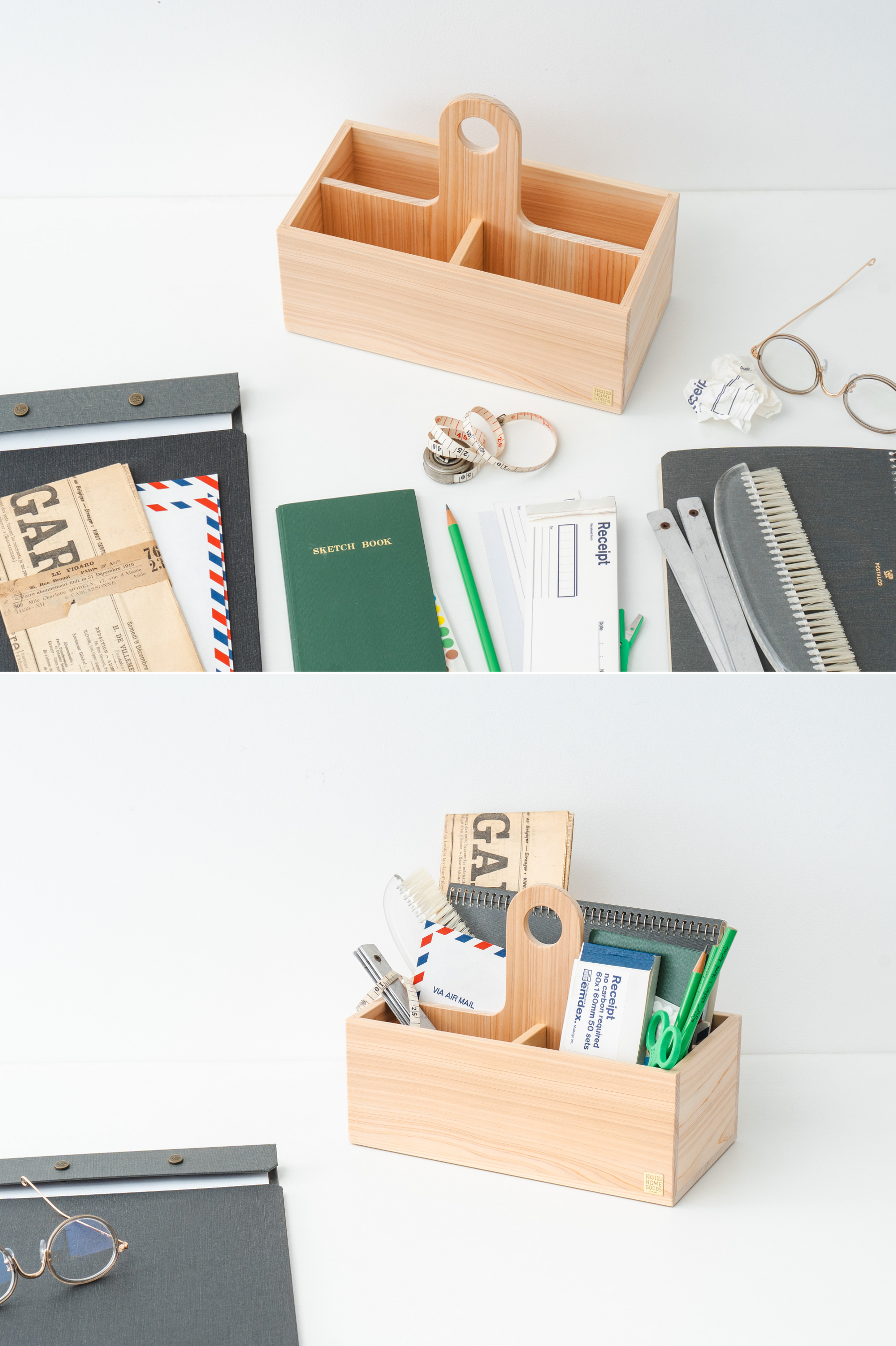 ノートに筆記具、その他諸々。デスクの上の散らかりがちな小物類を収納するボックス。オフィスのデスク、勉強用のデスクはもちろん、リビングのテーブルにあると便利なので是非お試しください。テレビやエアコンのリモコンなど "ちょっとしたもの" を収納する場所として重宝します。