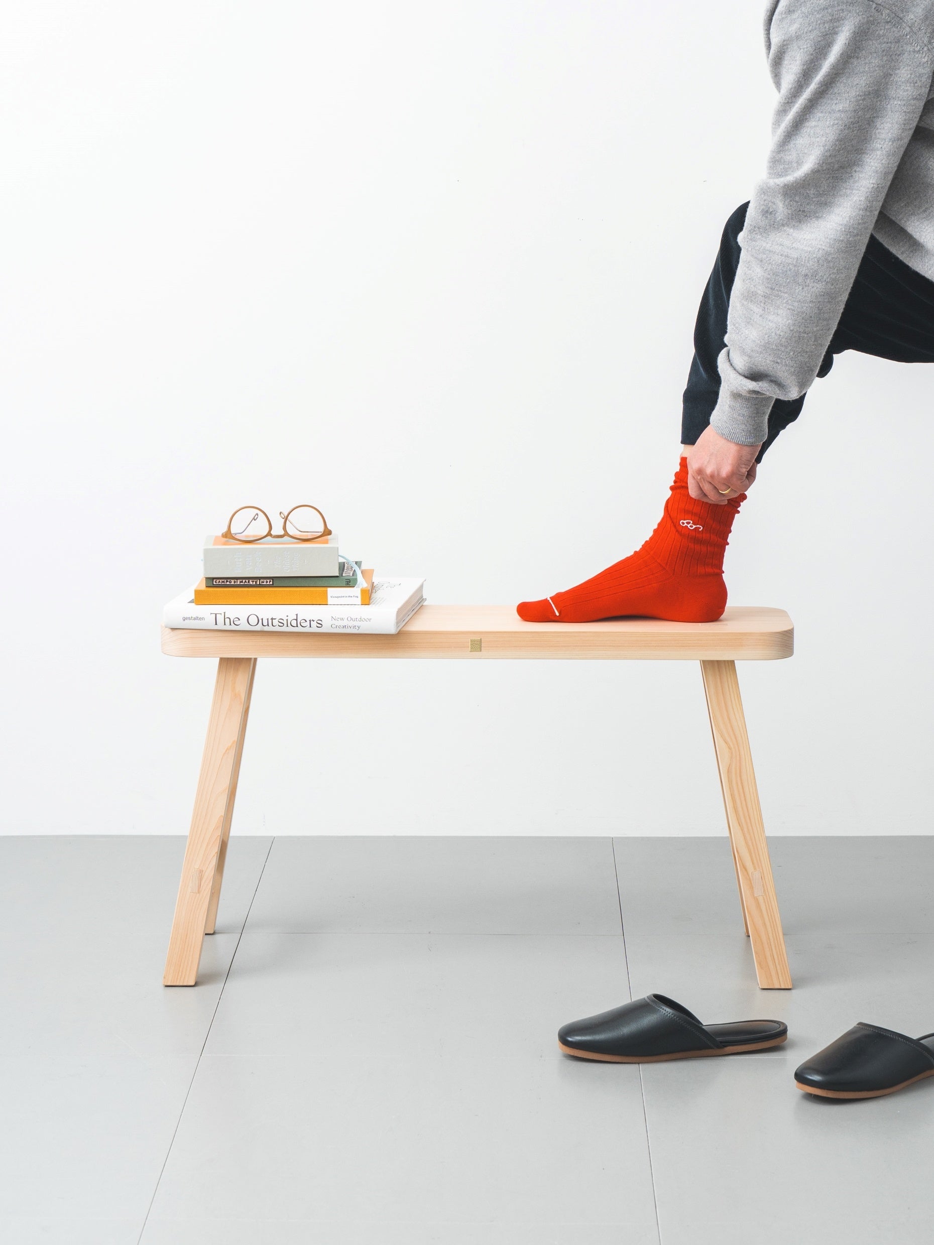 デザイナーの岡嶌要曰く 「靴下を履く時に便利なんです」。 素材/京都産 ヒノキ 無垢材 サイズ/幅:780mm 高さ:440mm 奥行:262mm 座面サイズ/幅:780mm 奥行:190mm