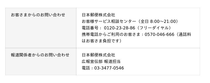 <日本郵便株式会社に関するお問い合わせ>[表1: https://prtimes.jp/data/corp/162852/table/45_1_de3046838227ee36ccceb271f02f9c60.jpg?v=202603301115 ]