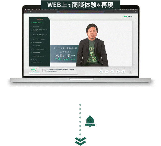 『CEOclone』は、トップセールスの商談を、Web上にインタラクティブな商談体験として再現することで、URL一つで人間に代わって営業活動をサポートするプラットフォームです。