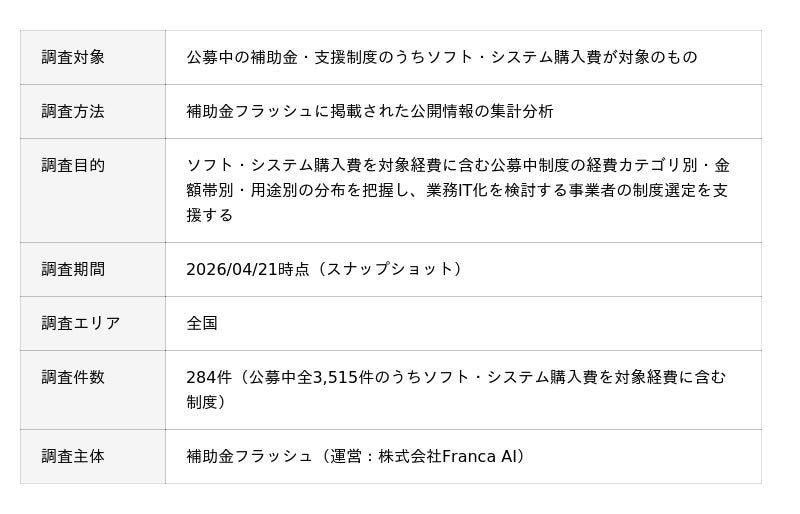 全国の補助金・助成金をAIで検索できるサービス『補助金フラッシュ』(https://hojokin-kensaku.jp/)は、同サービスに登録された補助金・助成金・支援制度のうち、2026/04/21時点で公募中の284件(ソフト・システム購入費を対象経費に含む制度)を集計分析しました。