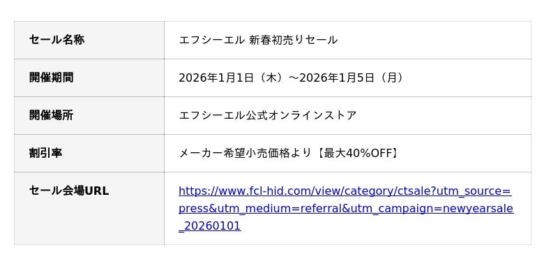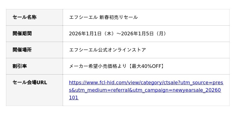 【最大40%OFF】エフシーエル(fcl.)が新製品も対象の「新春初売りセール」を2026年1月1日よりスタート