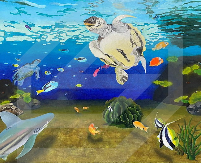 カメを大きく手前側に配置することでカメの力強さを表現。コバルトブルーの海中に色鮮やかな複数の魚を配置し、映える様な色づくりをしているところが特徴であり、工夫点です。