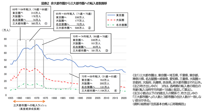 相続の発生に伴い家計資産の地域間移動が膨らむ最大の要因は、「地方に住む親と三大都市圏に住む子」という組み合わせが多いことである。日本では、1960年代〜70年代前半にかけ、非大都市圏(地方)から三大都市圏への大規模な人口移動が発生した(図表2の1.〜3.)。