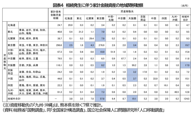 続いて、家計資産の中でも、相続の際に確実に移動し、かつ移動金額が把握しやすい「家計金融資産[末尾2参照]」について、今後30年程度の間に発生する相続に伴い、どの地域からどの地域へ、どれぐらいの金額が移動するのかを試算した。結果が図表4である。