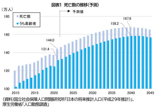 とりわけ、「高齢者の死亡数」は、長寿化の進展や団塊世代の死亡時期が近づくことと相まって、死亡総数を上回るスピードで増加、2040年前後に160万人弱でピークを迎える見込みである(図表1)。