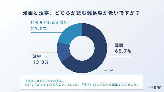 「漫画と活字、どちらが読む難易度が低いですか?」と質問したところ、「漫画」が65.7%、「活字」が13.3%、「どちらとも言えない」が21.0%という回答になりました。