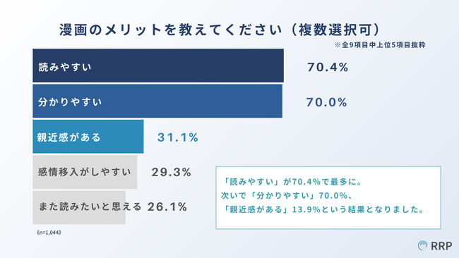 漫画のメリットは、「読みやすい」・「分かりやすい」が上位を占める