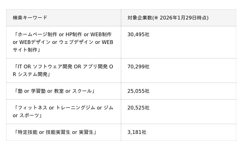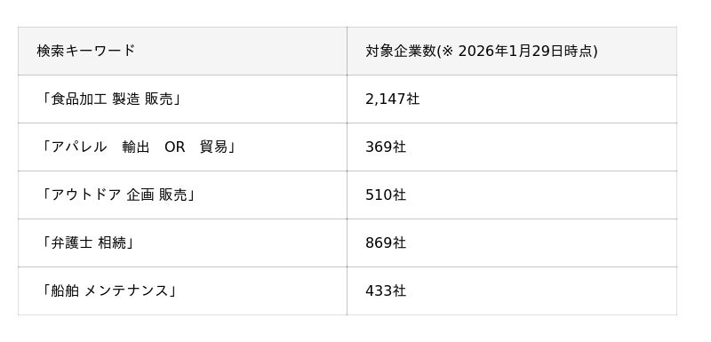 実際の運用では、これらのキーワード検索に「エリア」「従業員数」「設立年」「業種」といった企業属性を組み合わせることで、さらに精度の高いターゲットリストを作成することが可能です。