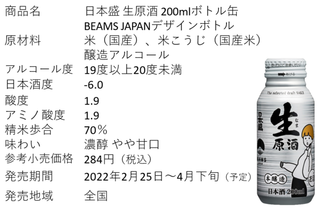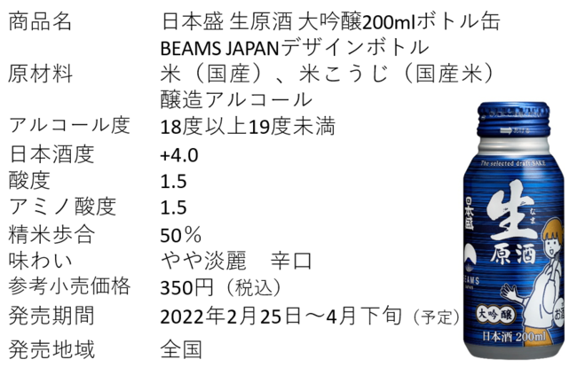 本プロジェクトは、普段、日本酒に馴染みのない若い世代に対して、日本酒をより身近で親しみやすい存在にすることを目指しています。第1弾商品の「別注 生原酒ボトル缶」は〈ビームス ジャパン〉3店舗で、発売から4日間で約250本、販売期間中に約1,200本販売と大変好評をいただきました。また、本プロジェクトが目指す日本酒を飲むことが少ない20~30代の方が購入の大半を占めていました。今回は第1弾と同じく、イラストレーターの白根ゆたんぽさんデザインの「日本盛 生原酒200mlボトル缶 BEAMS JAPANデザインボトル(本醸造、大吟醸)」を全国のスーパー、コンビニエンスストア及び日本盛オンラインショップで販売をいたします。さらに、ボトル缶に描かれた女の子をモチーフにした別注商品を〈ビームス ジャパン〉3店舗(新宿、渋谷、京都)、ビームス公式オンラインショップで販売いたします。