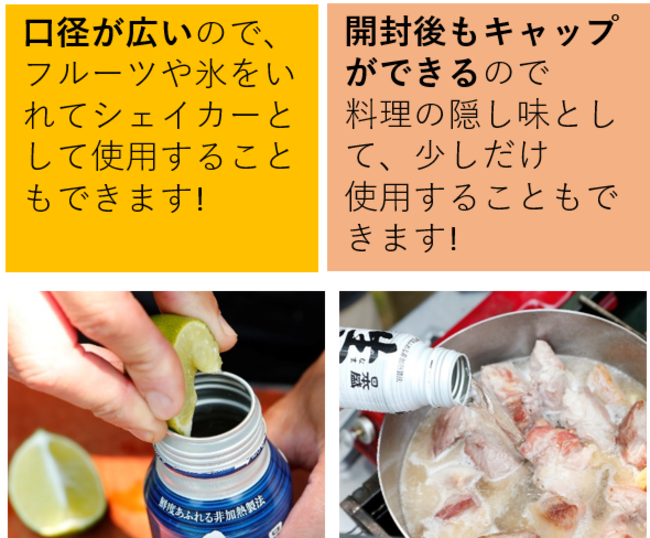 一般的に日本酒で使用されている容器に比べ、遮光性や密閉性に優れているため、デリケートな酒質である「生原酒」の品質保持が期待できます。