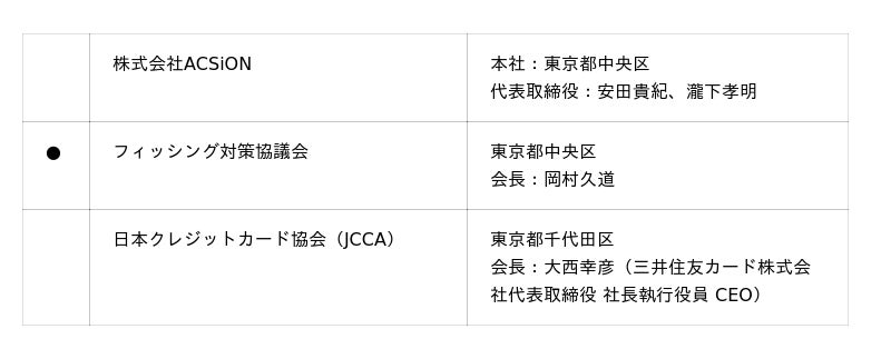 国内クレジットカード会社13社と株式会社ACSiON 、フィッシング対策協議会、日本クレジットカード協会が共同でフィッシングサイト閉鎖の取り組みを拡大